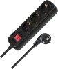 The 6 multiple socket strip in the color black and 1.4m cable impresses with its quality and safety in all areas. It not only has an increased protection against accidental contact, but also convinces with the following features: * Safety switch illuminated, can be switched on / off. * Protective contact sockets in 45° arrangement * Cable designation: H05VV-F 3G1.5Technical data
